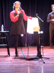 Playwright Anita Hollander begins her performance of “Still Standing” wearing her prosthetic leg.